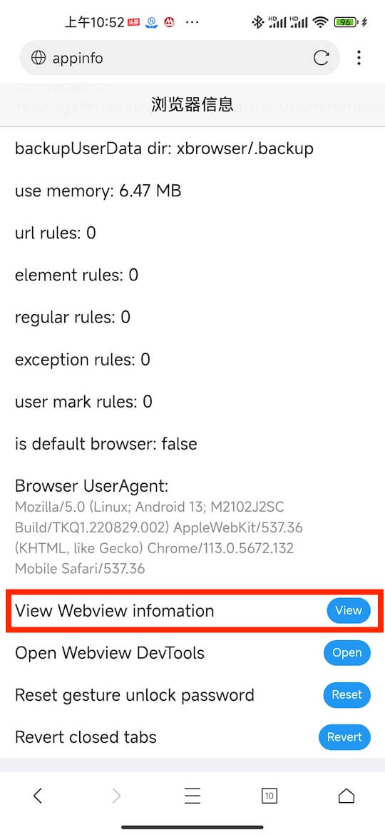 Enter x:info in the browser address bar, and there is an option “View WebView information” on the page